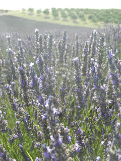 It wasn't all that much longer that our quest was finally fulfilled. Seriously, it was like a scene from a movie where we drove over a flat hill, golden with leftover hay, and suddenly there it was....our first lavender field!!!